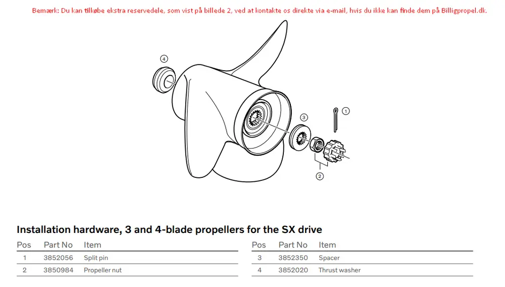 Bemærk: Du kan tilkøbe ekstra reservedele, som vist på billede 2, ved at kontakte os direkte via kontaktformularen, hvis du ikke kan finde dem på Billigpropel.dk.
