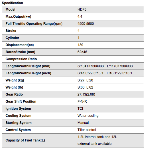 Motoren her er også udstyret med både frem og bak-gear, og som en af de eneste motorer med TCi tænding. Tankkapacitet 1.2 Liter. Max omdrejninger mellem 4.500 og 5.500. For let og komfortabel transport er motoren udstyret med et bærehåndtag bagerst på motoren. Motoren er både CE og EPA (Enviromental Protection Agency) godkendt! Bemærk at denne 6 HK påhængsmotor kommer med både intern tank (ikke model med elstart) og ekstern tank på 12 liter samt slange hertil måneden ud.