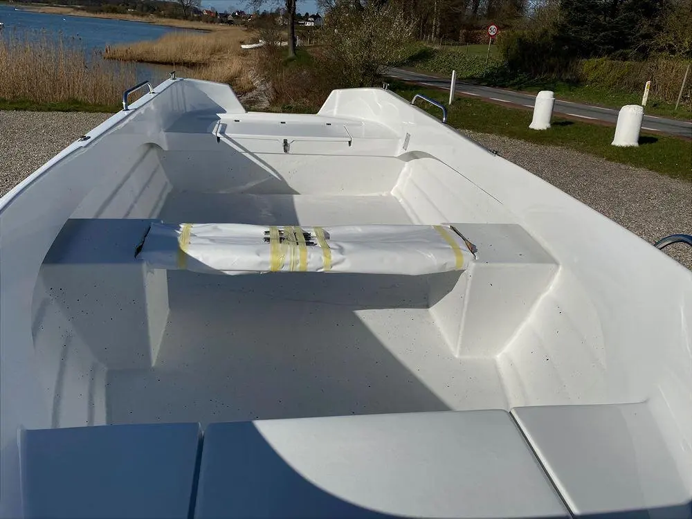 Fjordjollen har lagt stor vægt på sikkerheden, derfor har de valgt en konstruktion der giver båden en helt plan dørk samt et højt fribord. Jollen er dobbeltskroget og har 3 stk. aflåselige stuerum, 2 rum for og 1 rum agter. En ekstra fin finesse er den aftagelige tofte, der gør det muligt at benytte hele dørken uden forhindringer. Båden planer allerede ved 15 HK og 2 personer. Der er 2 års garanti på produktet.